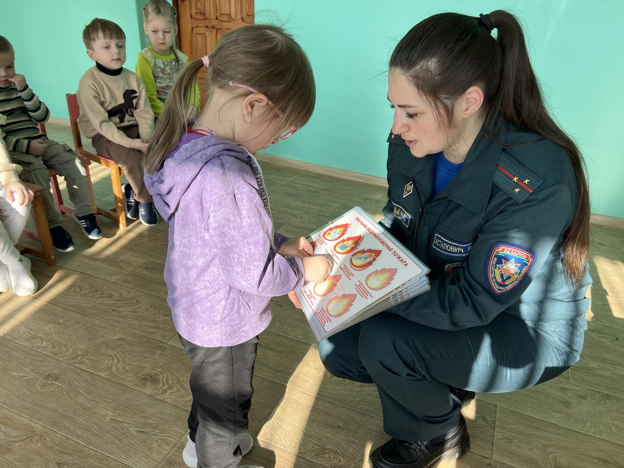 Для самых маленьких жителей района занятие началось с беседы об основных правилах безопасности, а для лучшего усвоения материала инспектор закрепила информацию интерактивными играми. Дошколятам напомнили номера телефонов экстренных служб, а также единые номер - 112, разобрали алгоритм «5 шагов спасения» и отработали навык, как покинуть задымлённое помещение. Воспитанники чётко уяснили главное: спички и зажигалки – не игрушка, а места для игр должны быть безопасными.